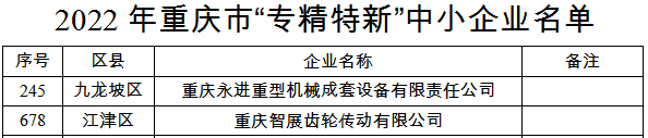 6月1日,重慶市經(jīng)濟和信息化委員會公布了2022年重慶市“專精特新“中小企業(yè)名單,經(jīng)主管部門審核推薦、第三方機構(gòu)評審和公示等程序,重慶智展齒輪傳動有限公司、重慶永進重型機械成套設(shè)備有限責(zé)任公司均成功入選。