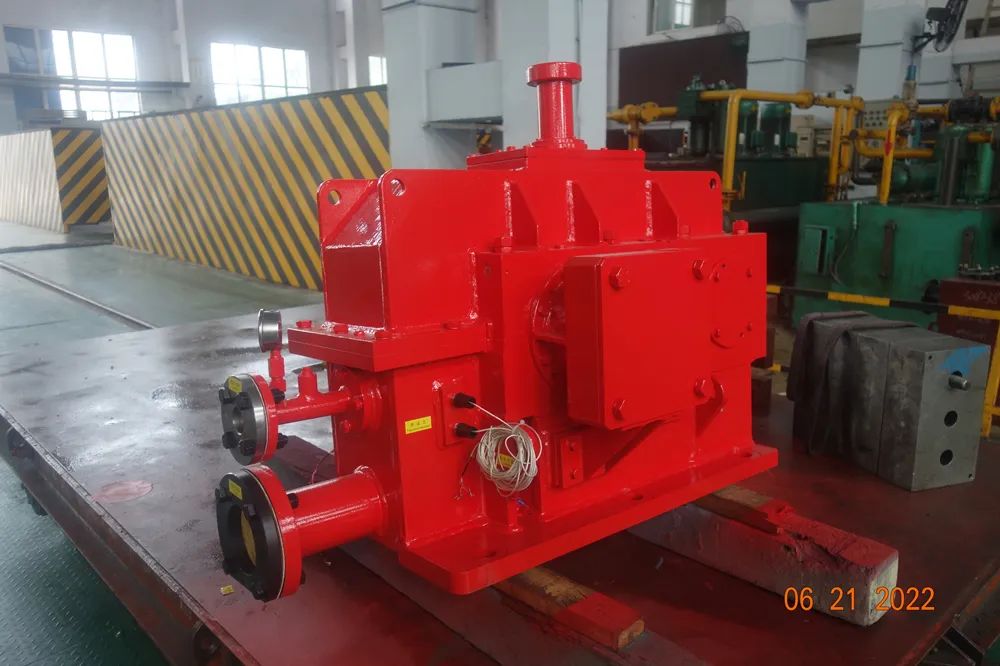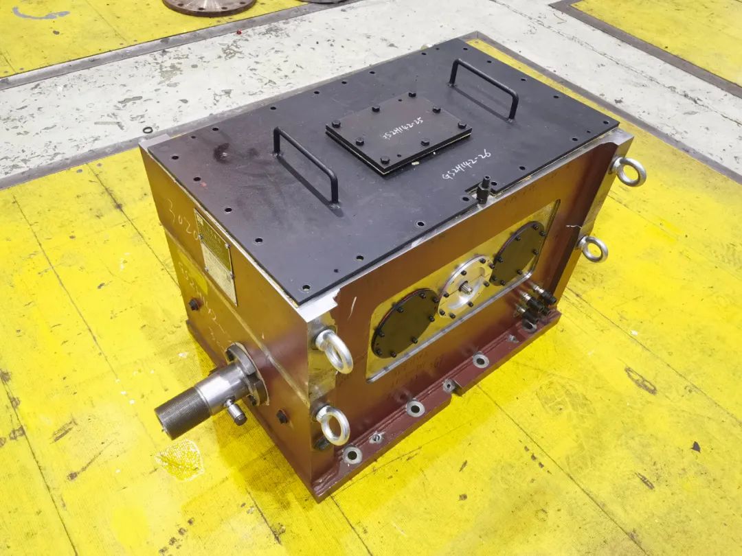 該齒輪箱應用于某石油單位研發用車載壓裂泵,總重量1.8T,輸出馬力2088hp。齒輪箱為一級平行級+行星齒輪傳動,采用拼裝人字齒設計,大大降低了安裝空間和重量,實現了較窄空間中大中心距超高功率密度傳動,為我司進軍石油機械行業奠定了重要基礎。